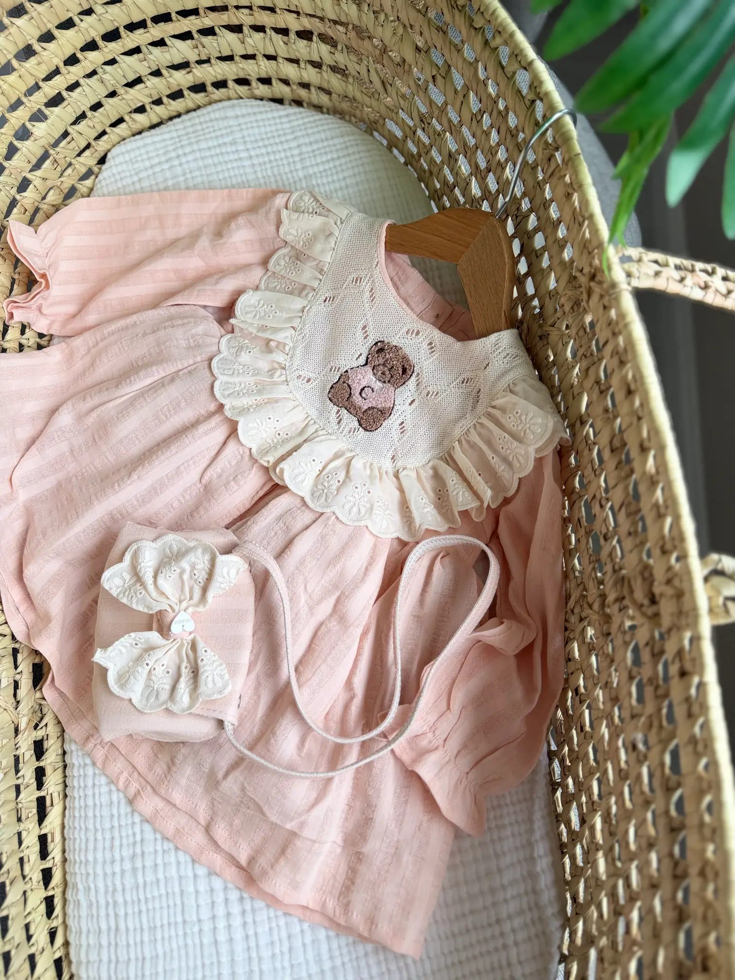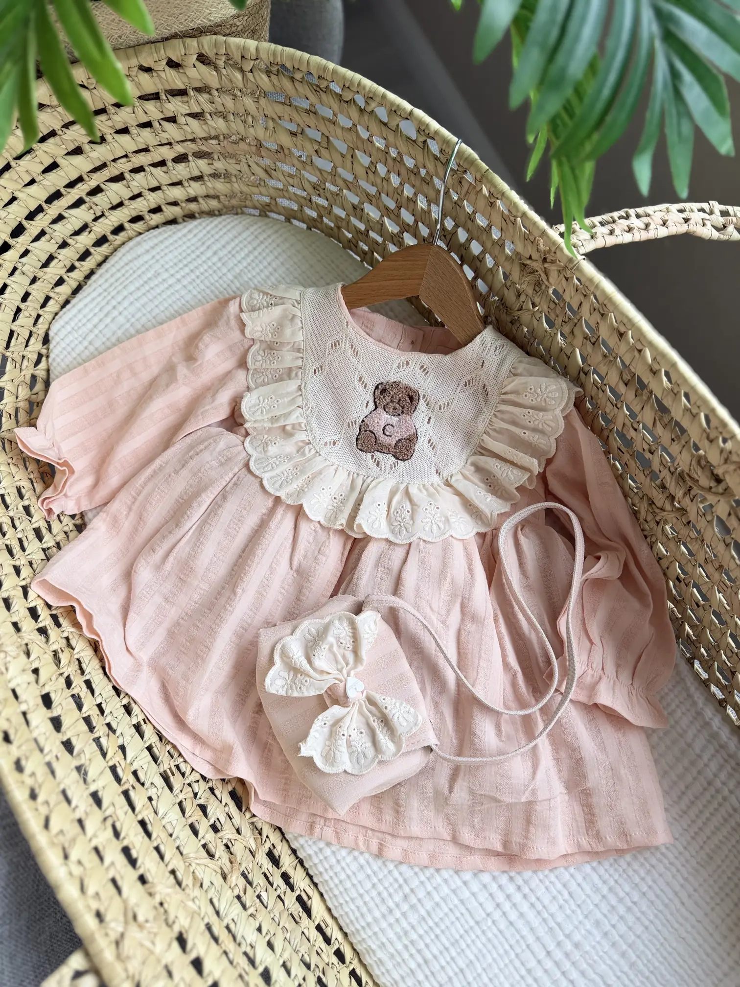 Soft blush cotton with a tonal stripe weave gives this little dress a floaty drape, while the scalloped lace bib and tiny teddy applique bring the nostalgia factor. The matching bow pouch can hold keepsakes or simply complete the look. Pair it with knee socks for birthdays, cake smash sessions, or any day you want extra charm.