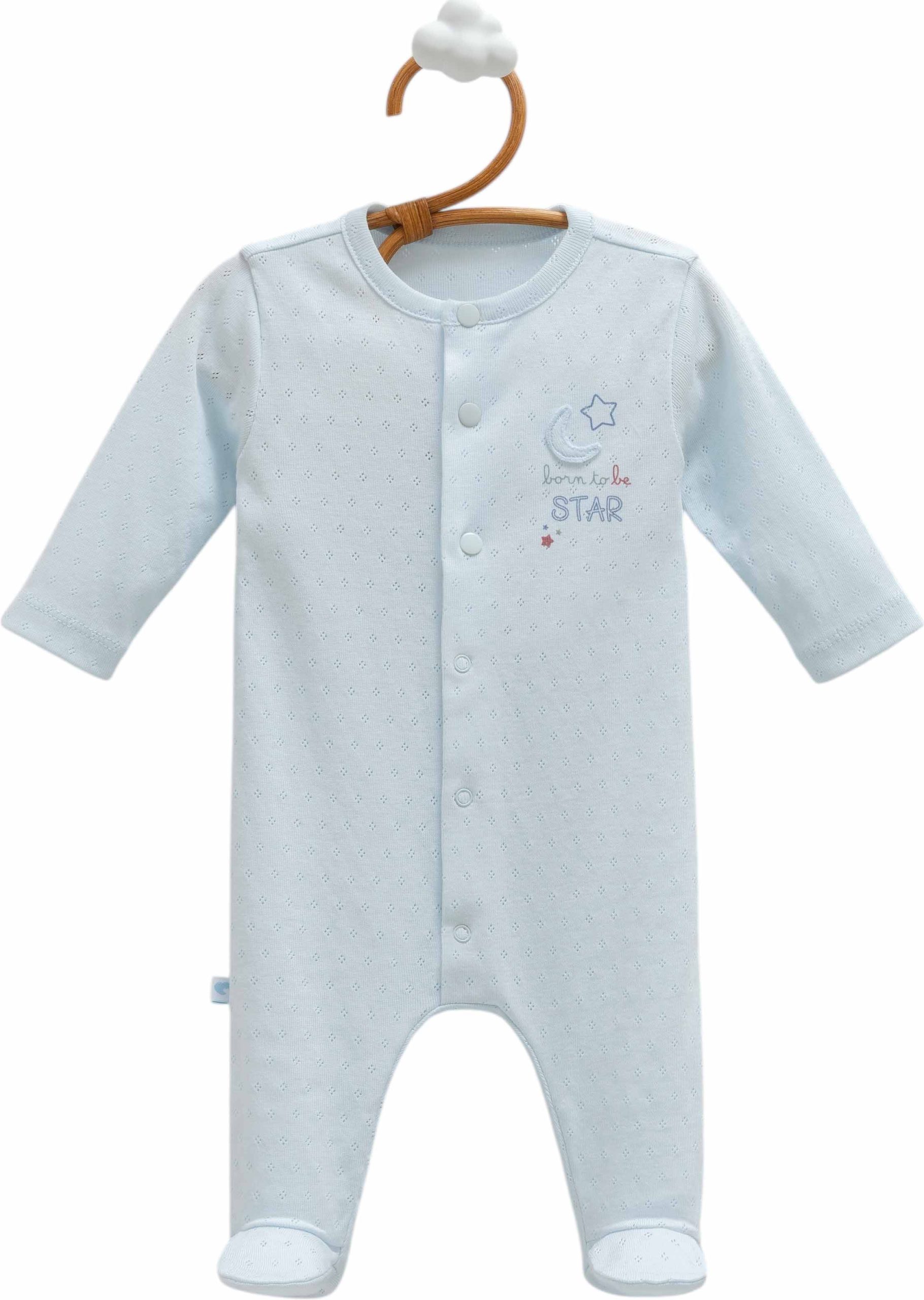 A soft light blue newborn romper with palm tree prints, wooden buttons, and a cute front pocket for a relaxed summer look.