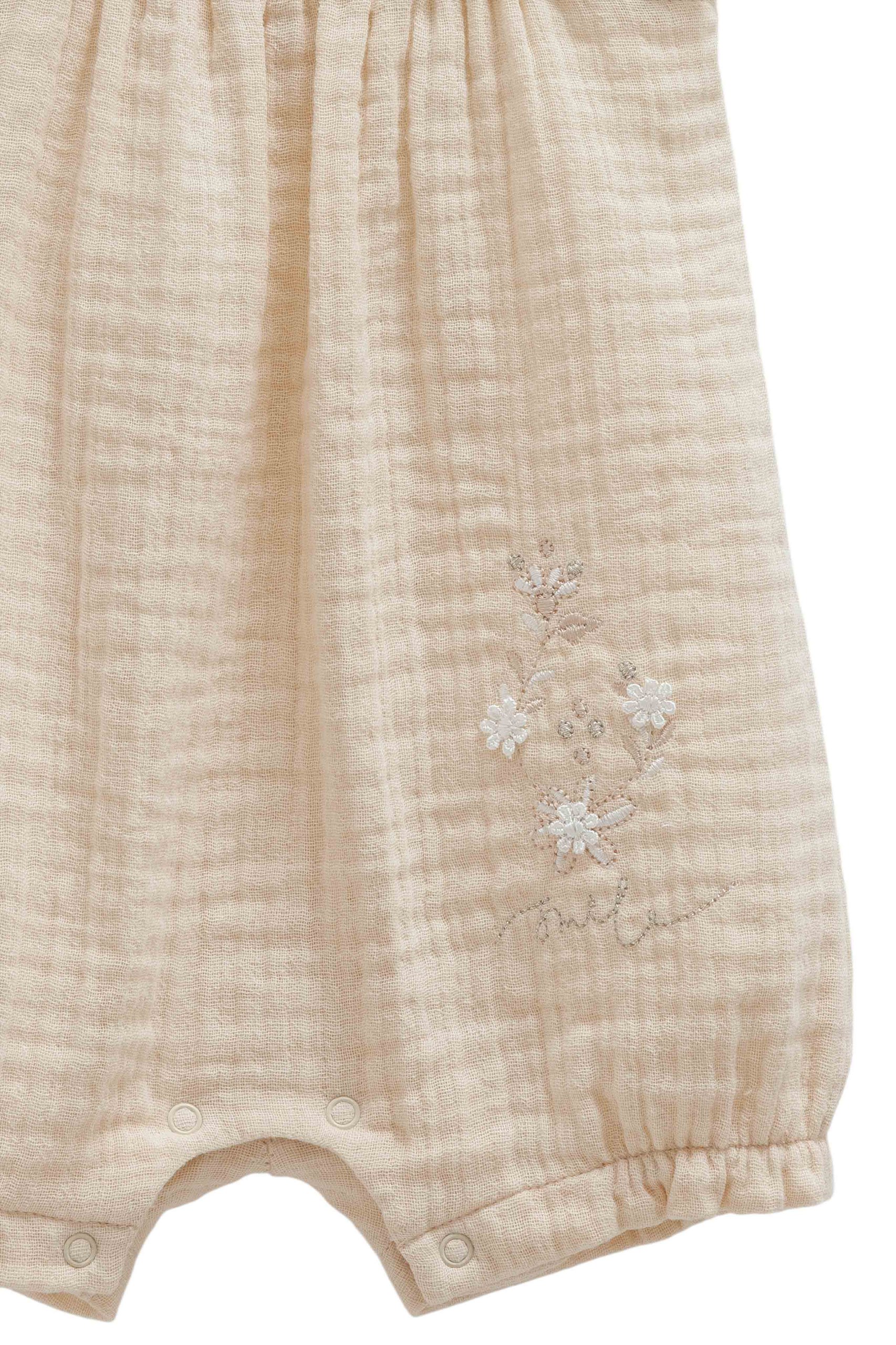 A soft beige newborn romper with delicate ruffled straps and floral embroidery, made from lightweight breathable fabric for gentle comfort.