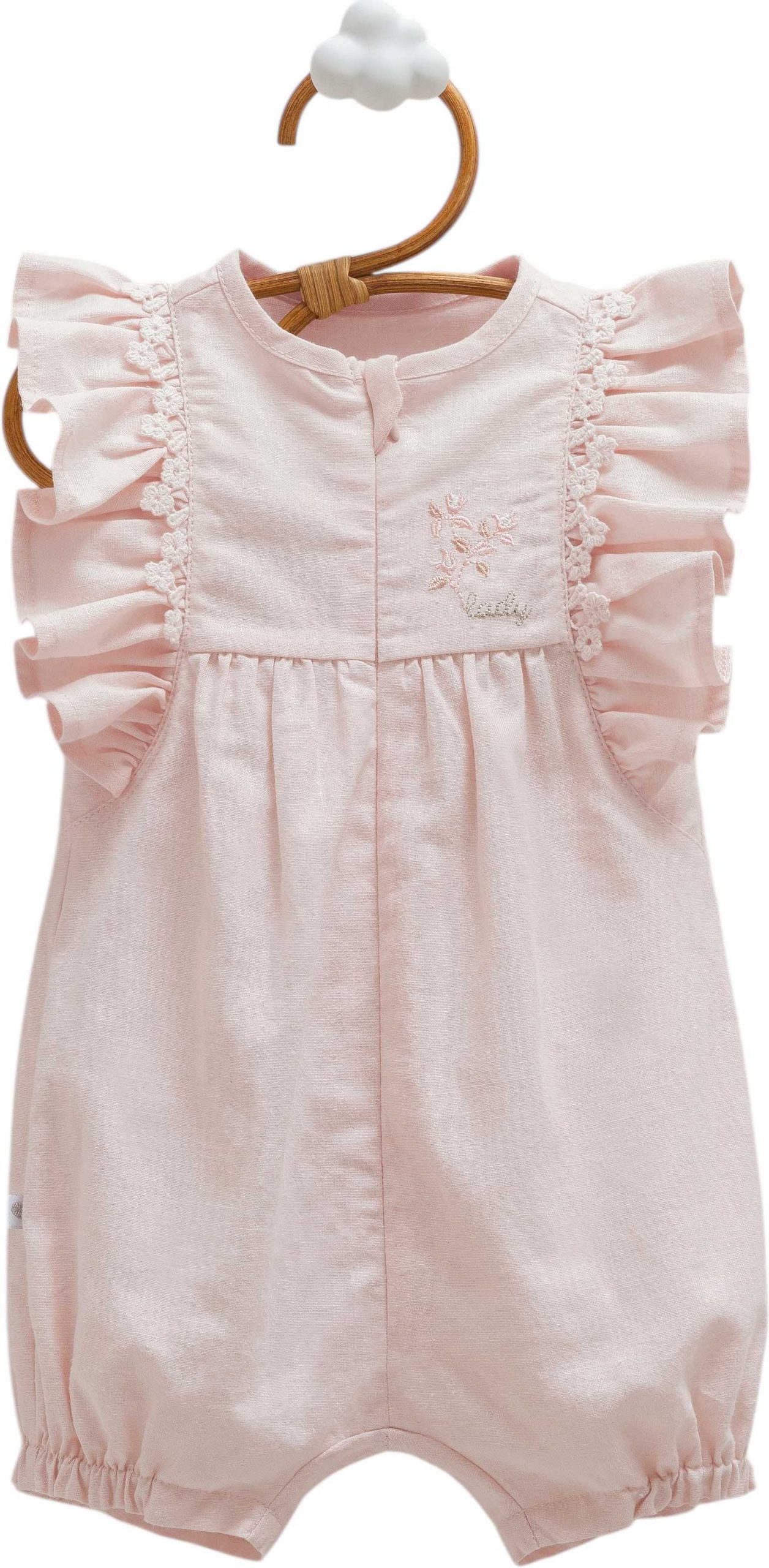 A soft blush pink newborn romper with delicate ruffled sleeves, lace trim, and a sweet embroidered detail, perfect for keeping your little one comfortable and adorable.